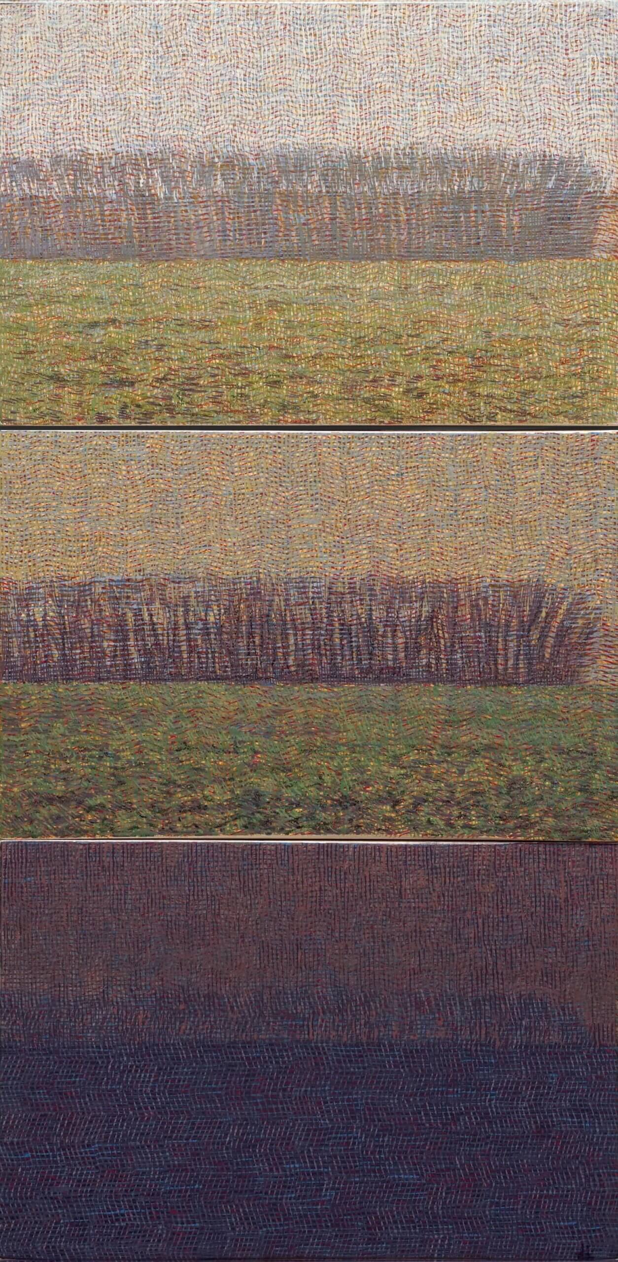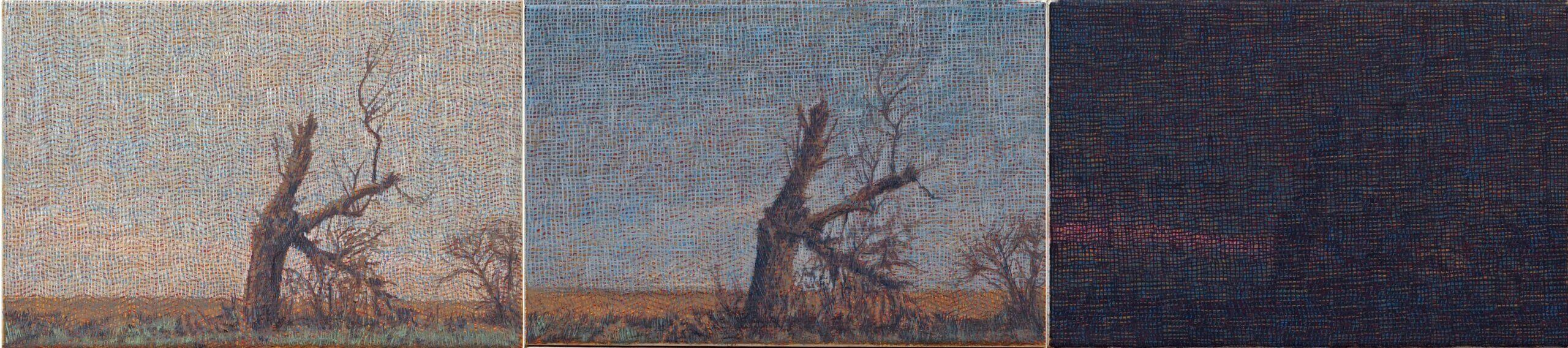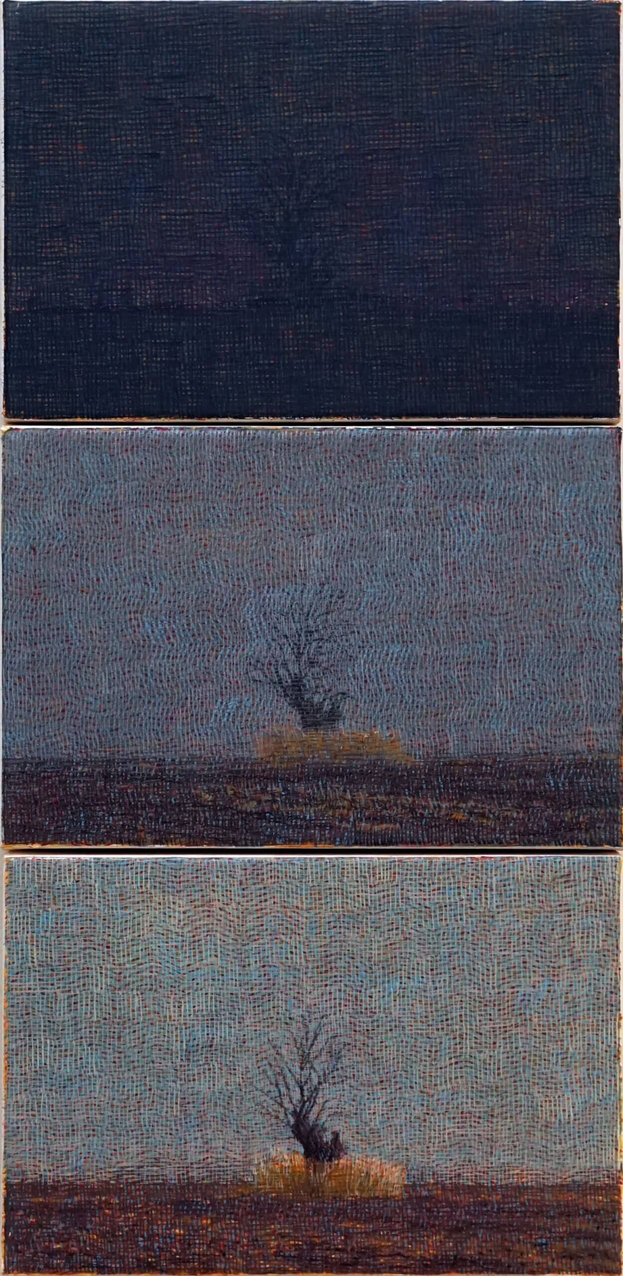 This cycle originated primarily by chance, from a simple subconscious idea: to summarize the chronology of a day of a certain landscape segment in light variations. While mapping out drafts and making targeted visits to the landscape at three phases of the day — noon, evening, and night — I noticed a very simple detail that initially prevented me from clearly defining my intended goal.